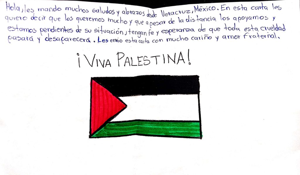 Hello, I send you many greetings and hugs from Veracruz, Mexico. In this letter, I want to tell you that we love you very much and that despite the distance, we support you and are keeping an eye on your situation; have faith and hope that all this cruelty will pass and disappear. I send you this letter with much affection and fraternal love.