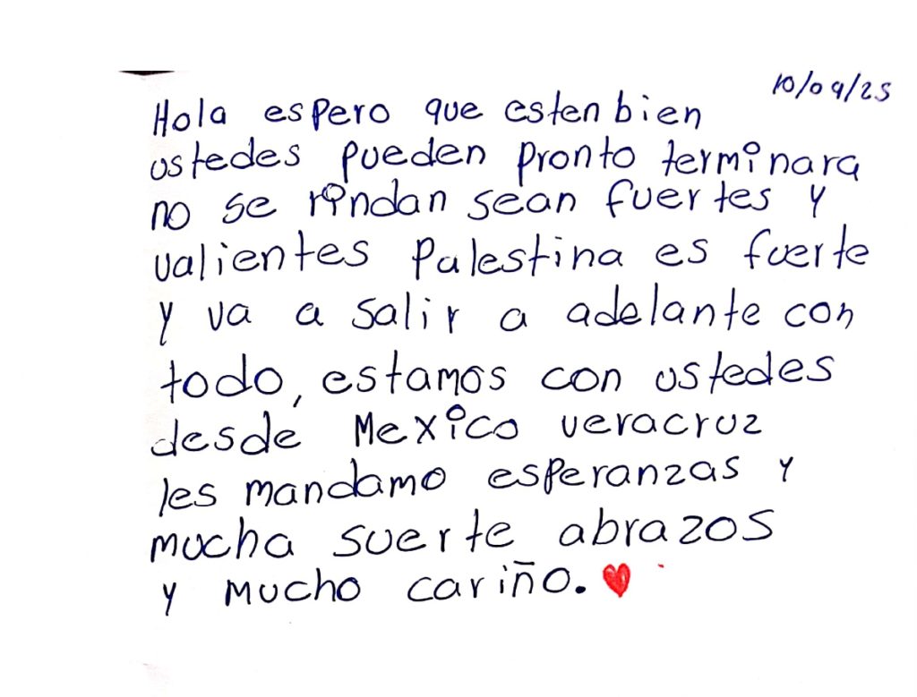Hello, I hope you are well. You can do it; soon it will end. Do not give up; be strong and brave. Palestine is strong and is going to move forward with everything. We are with you from Veracruz, Mexico; we send you hope and much luck, hugs, and much affection. ❤️