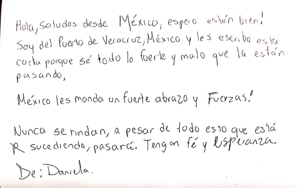 Hello, greetings from Mexico, I hope you are well! I am from the Port of Veracruz, Mexico, and I am writing this letter to you because I know all the hard and bad things you are going through.
