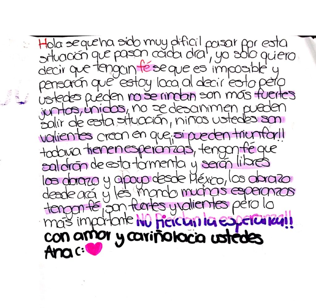 Hello, I know it has been very difficult going through this situation that happens every day. I only want to say: have faith. I know it seems impossible and you will think I am crazy for saying this, but you can do it. Do not give up; you are stronger together, united. Do not be discouraged; you can get out of this situation. Children, you are brave; believe that you can triumph!! You still have hope; have faith that you will come out of this storm and you will be free. I hug you and support you from Mexico. I hug you from here and send you much hope. Have faith; you are strong and brave, but most importantly: DO NOT LOSE HOPE!!