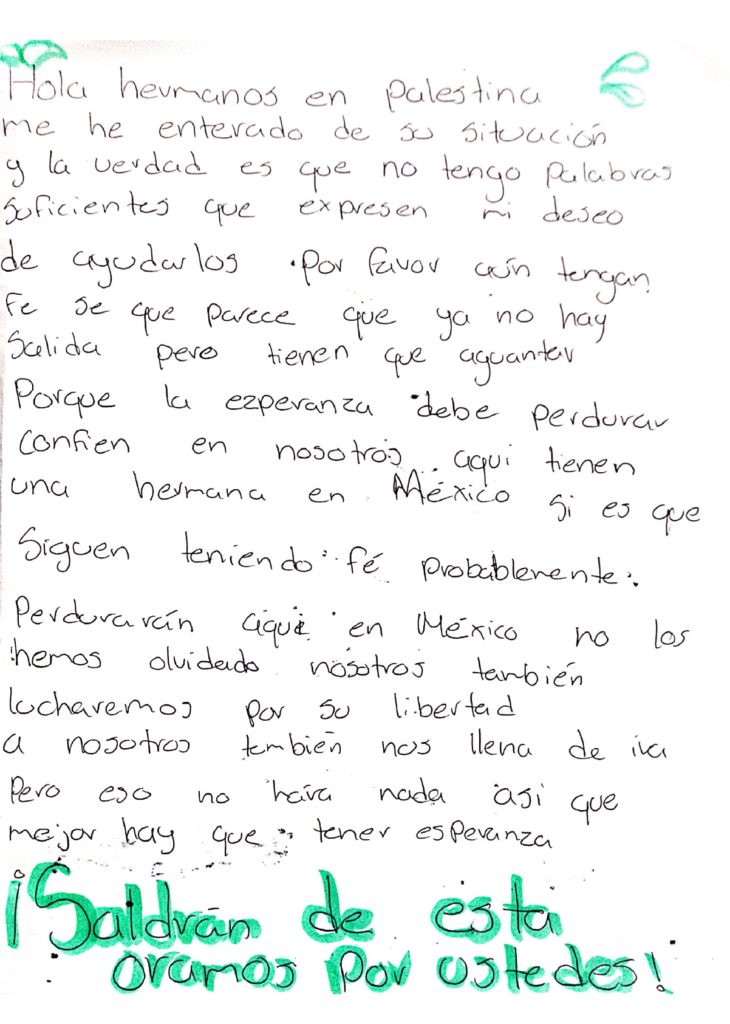 Hello brothers in Palestine, I have found out about your situation and the truth is that I do not have enough words to express my desire to help you. Please still have faith; I know it seems like there is no way out anymore, but you have to endure because hope must persevere. Trust in us; here you have a sister in Mexico. If you continue having faith, you will likely endure. Here in Mexico, we have not forgotten you; we will also fight for your freedom. It also fills us with anger, but that will not do anything, so it is better to have hope.