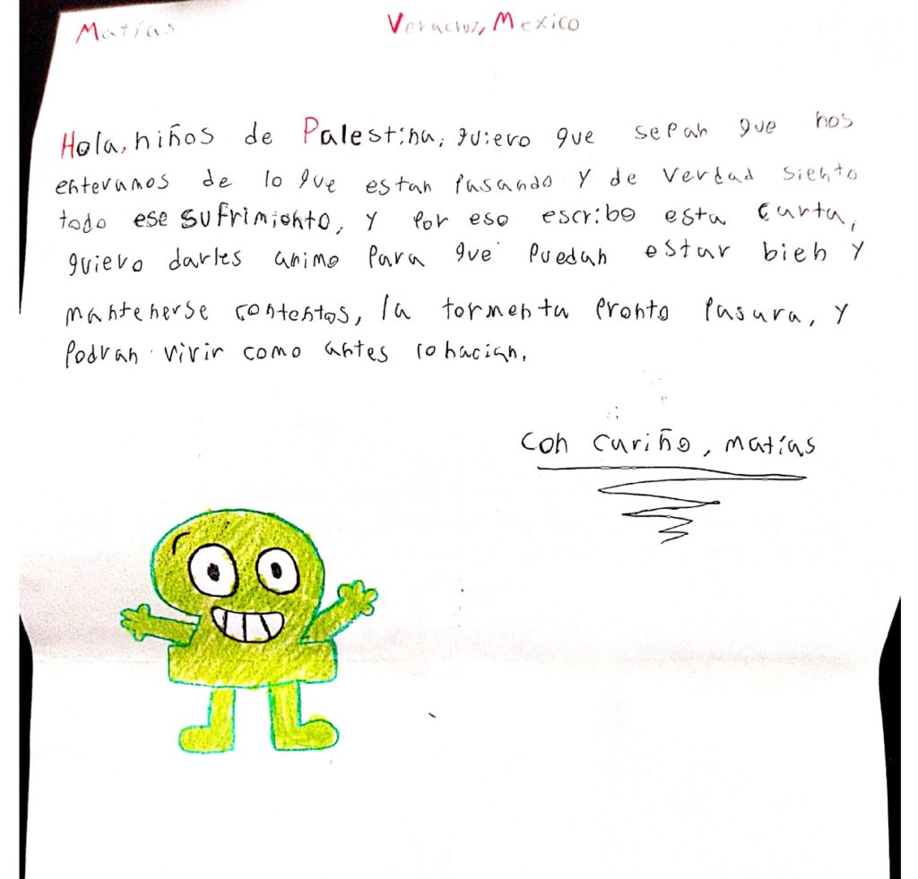 Hello, children of Palestine; I want you to know that we find out about what you are going through and I truly feel all that suffering, and that is why I write this letter. I want to give you encouragement so that you can be well and stay happy; the storm will soon pass, and you will be able to live as you did before.