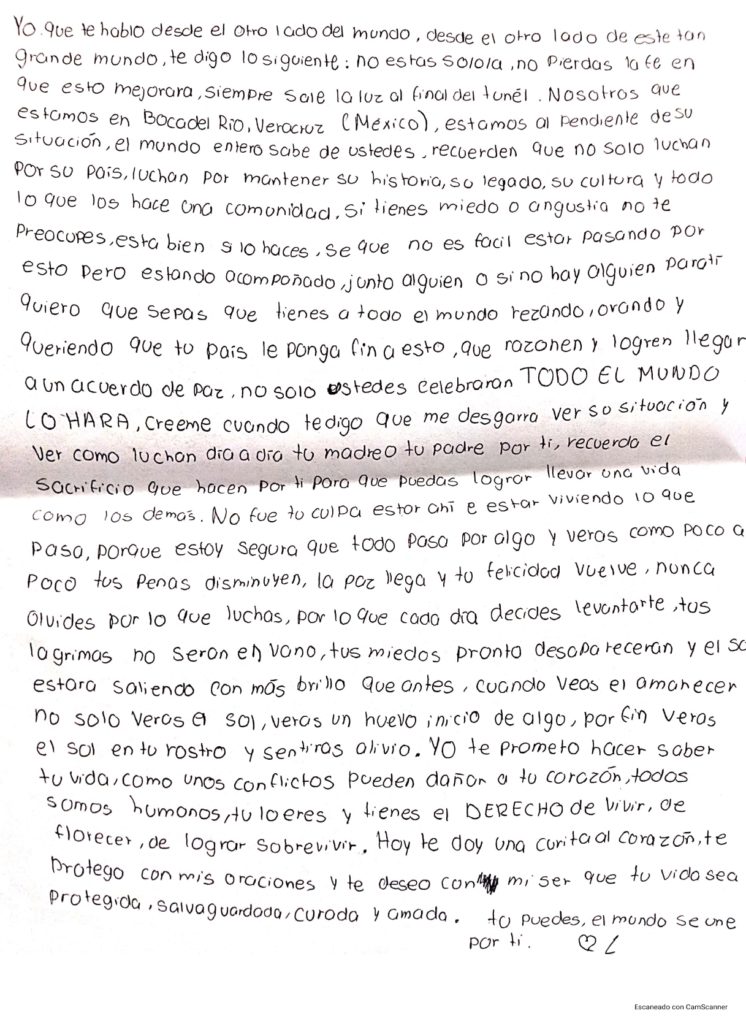 I, speaking to you from the other side of the world, from the other side of this so very large world, tell you the following: you are not alone; do not lose faith that this will improve; light always emerges at the end of the tunnel. We who are in Boca del Río, Veracruz (Mexico), are keeping a close watch on your situation; the entire world knows about you. Remember that you are not just fighting for your country; you are fighting to maintain your history, your legacy, your culture, and everything that makes you a community.