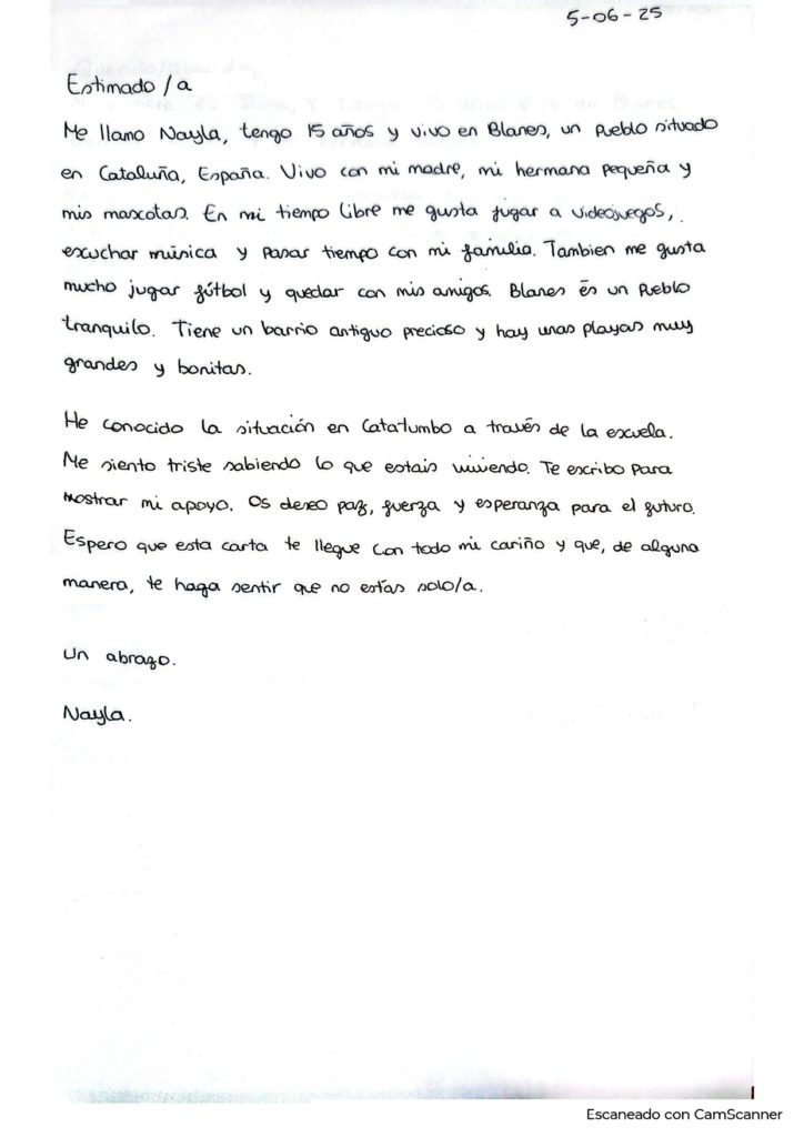 I have learned about the situation in Catatumbo through school. I feel sad knowing what you are going through. I am writing to you to show my support. I wish you peace, strength, and hope for the future.