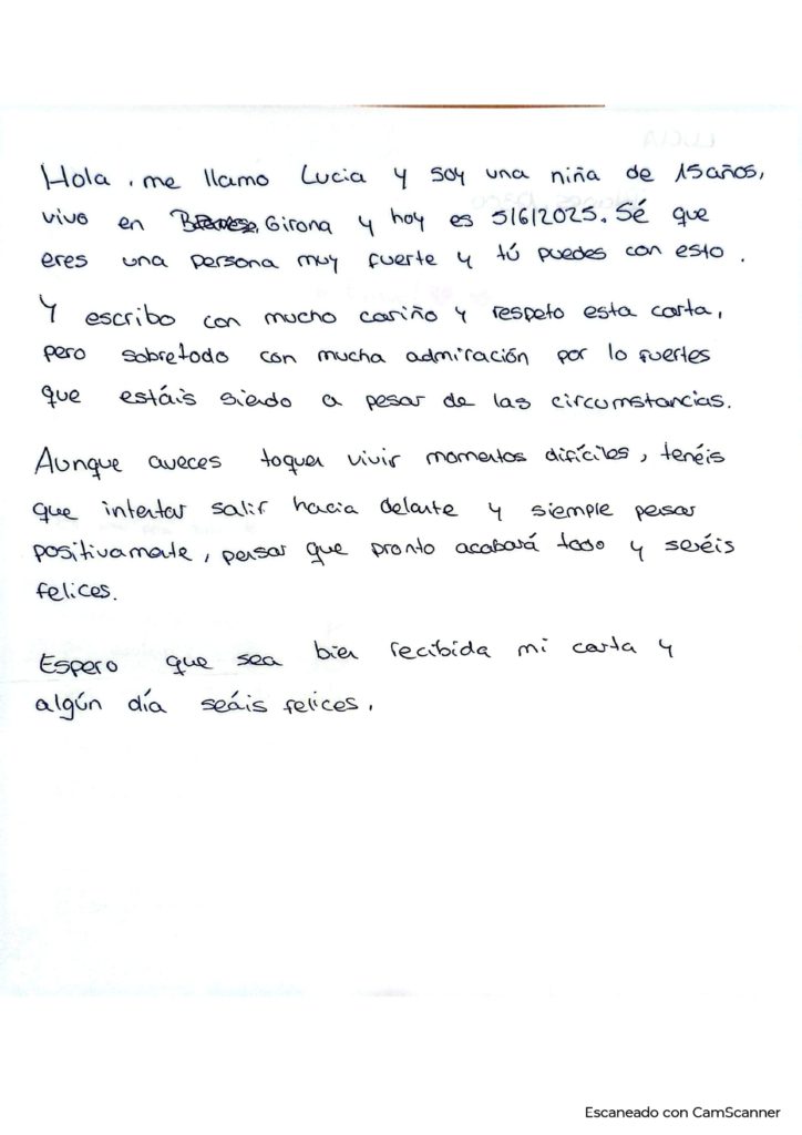Hello, my name is Lucia and I am a 15-year-old girl. I live in Girona and today is 5/6/2025. I know you are a very strong person and you can get through this.