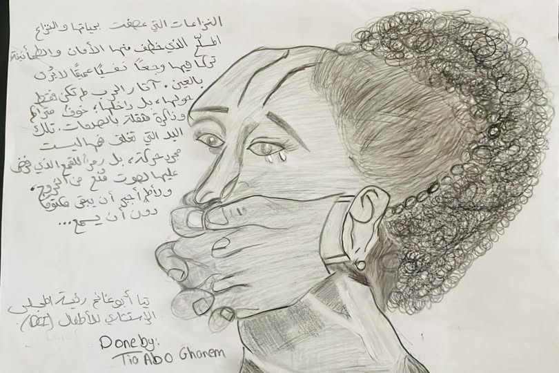The conflicts that swept through her life, and the armed conflict that stole her safety and peace, have left within her a deep psychological pain that cannot be seen with the eye. The effects of war were not only around her, but inside her as well accumulated fear and a memory burdened with trauma. That hand covering her mouth is not merely a gesture, but a symbol of the oppression imposed on her, of a voice prevented from being heard, and of pain forced to remain suppressed inside her without ever being expressed.