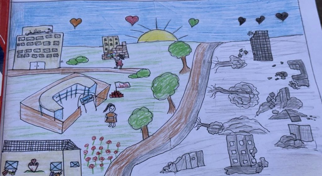 These artistic works were developed within the framework of the Child Protection Area of Responsibility (CP AoR) initiative “Gaza We Want.” The initiative supports children and young people in expressing their hopes, experiences, and visions for a peaceful future through creative and artistic mediums.