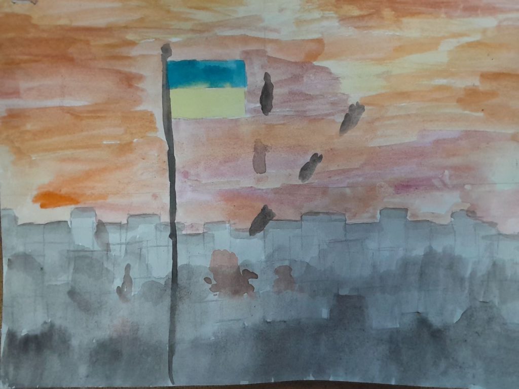 This drawing is about the war in Ukraine.The gray wall on the left represents the cold, destruction, and the shelters where we have to hide.But I added bright colors—orange and pink—because they symbolize our warmth and the life that cannot be stopped.The small flag in the center is our unbreakable hope.The dark strokes at the bottom look like birds flying toward the light.